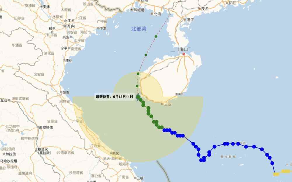6月13日14时至14日14时,南海大部、北部湾、琼州海峡、西沙群岛、南沙群岛、中沙群岛、广东沿海、海南岛沿海、广西沿海或有6-8级风,阵风9-10级,台风中心经过的北部湾部分海域风力可达9-11级,阵风12-13级。