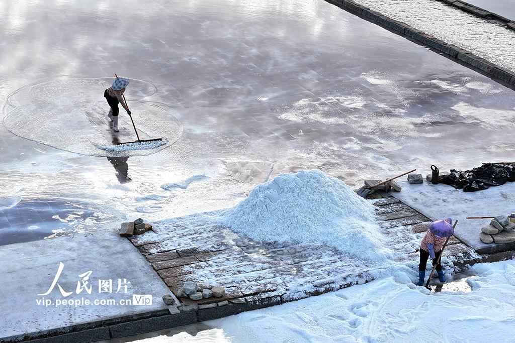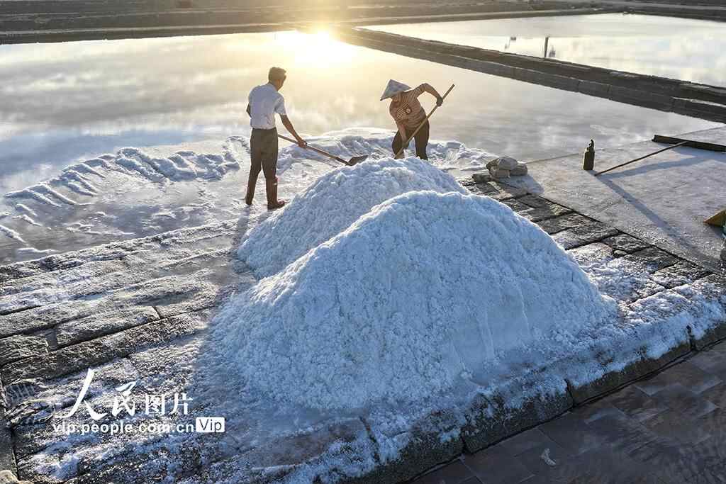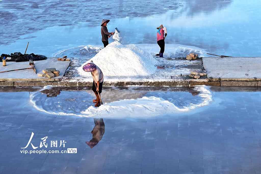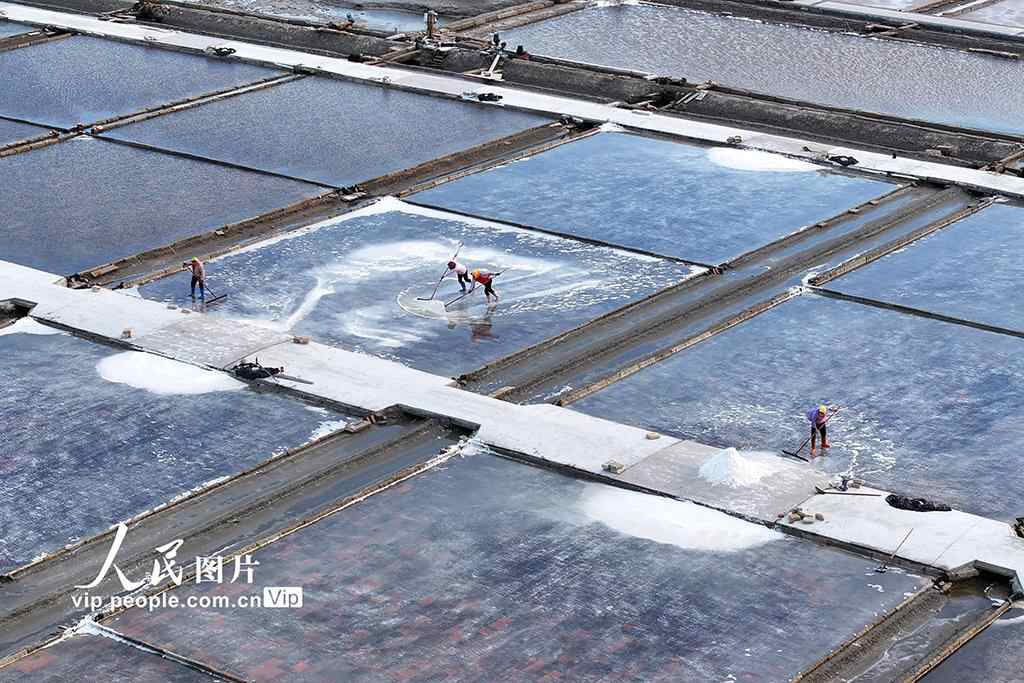 2025年6月12日,盐农在福建省泉州市泉港区的山腰盐场收盐。王旺旺摄(人民图片网)