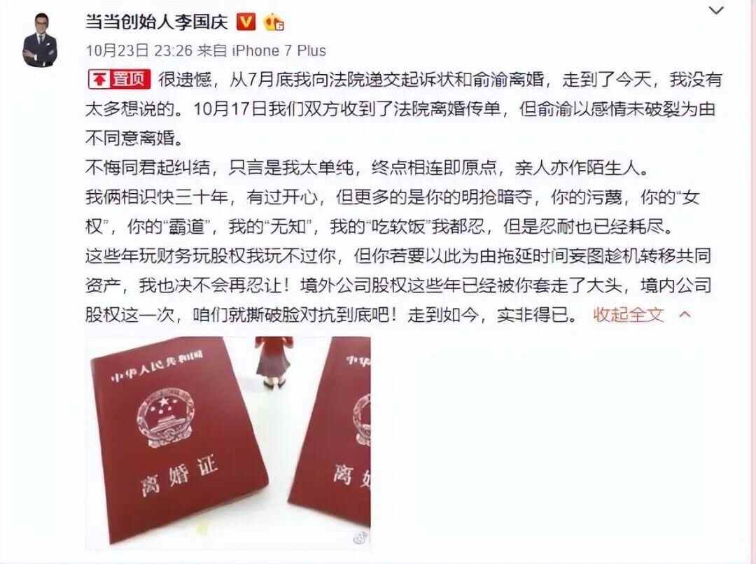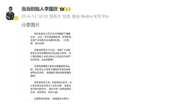 6月13日,早晚读书总编辑、当当网创始人李国庆在个人社媒发文称自己与前妻俞渝就相关财产分割已达成最终和解。