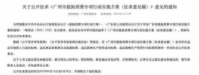 6月12日,《广州市提振消费专项行动实施方案(征求意见稿)》公开征求意见。
