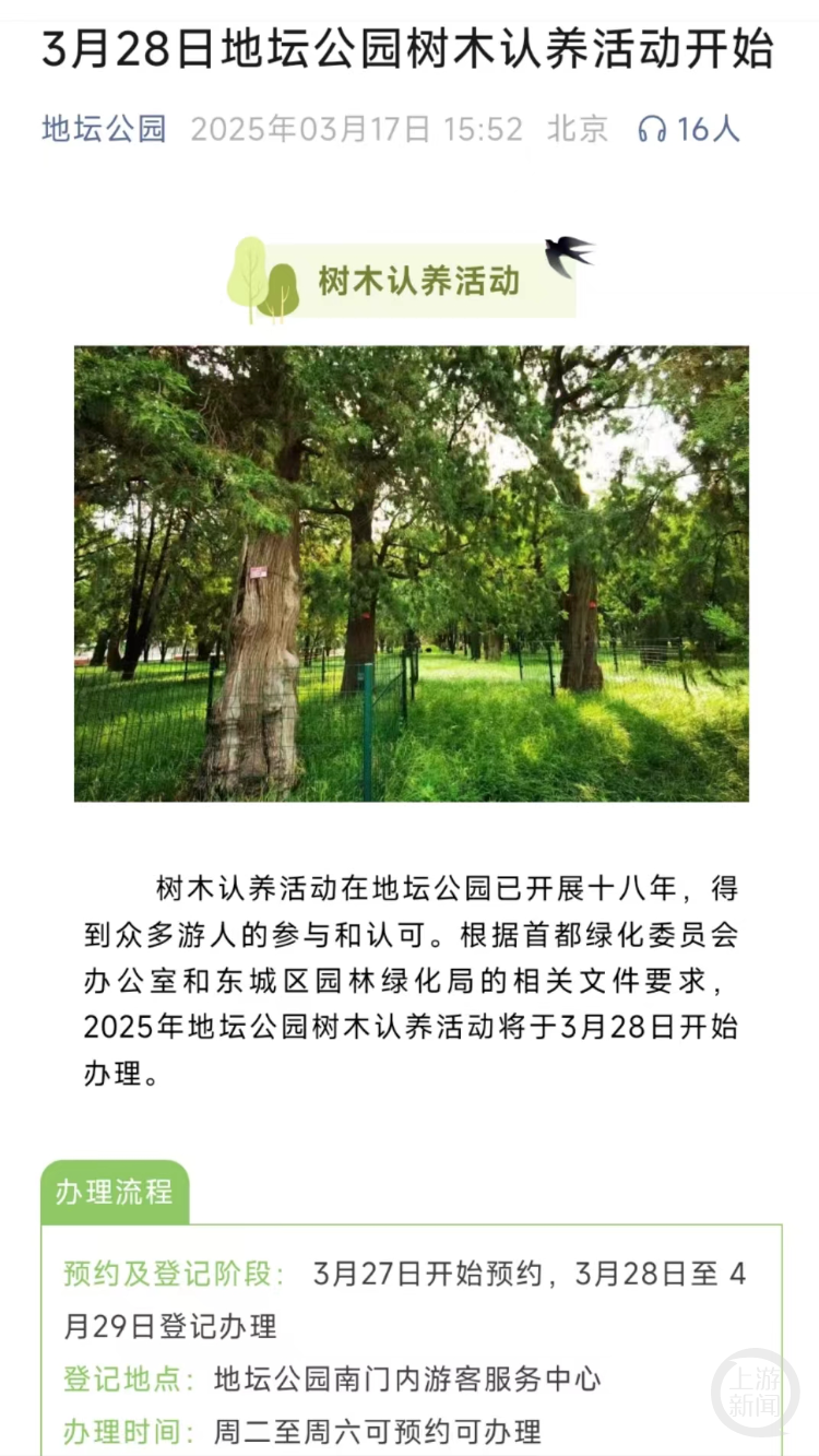 记者搜索发现,今年3月17日,微信公众号“地坛公园”曾发布文章《3月28日地坛公园树木认养活动开始》,文章介绍,“ 树木认养活动在地坛公园已开展十八年,得到众多游人的参与和认可。根据首都绿化委员会办公室和东城区园林绿化局的相关文件要求,2025年地坛公园树木认养活动将于3月28日开始办理。