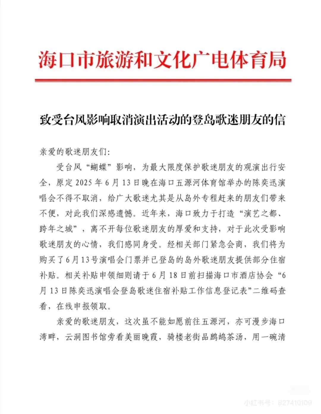 受台风“蝴蝶”影响,为最大限度保护歌迷朋友的观演出行安全,原定2025年6月13日晚在海口五源河体育馆举办的陈奕迅演唱会不得不取消,给广大歌迷尤其是从岛外专程赶来的朋友们带来不便,对此我们深感遗憾,近年来,海口致力于打造“演艺之都、跨年之城”,离不开每位歌迷朋友的厚爱和支持,对于此次受影响歌迷朋友的心情,我们感同身受。