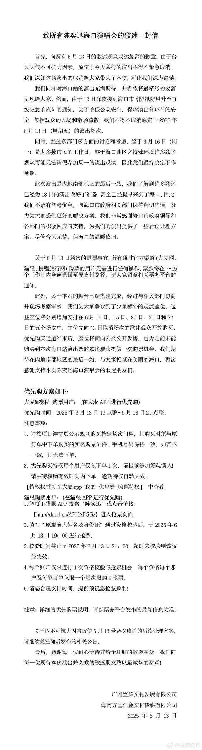 13日14时许,@宝辉娱乐 发布 致所有陈奕迅海口演唱会的歌迷一封信。