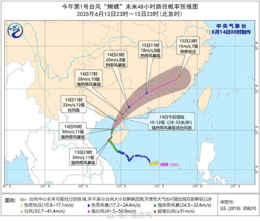 6月14日6时,今年第1号台风“蝴蝶”(强热带风暴级)中心位于北纬19点9度,东经108点8度,也就是位于广东省雷州市西南方向约175公里的海面上,中心附近最大风力11级,达到30米每秒的风速,中心最低气压980百帕,6级大风半径范围约320公里。