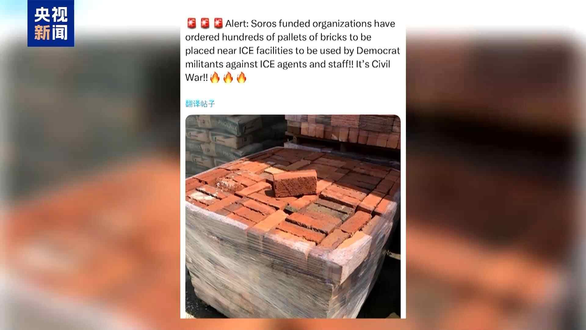 文章举例说,有用户在社交媒体平台X发布了一张一大摞砖头的照片并配文说,这些砖头是由货币投机商乔治·索罗斯支持的非营利组织购买,放在美国移民与海关执法局的办公场所附近,给所谓的“民主党武装分子”用来对付移民与海关执法局的工作人员用的。