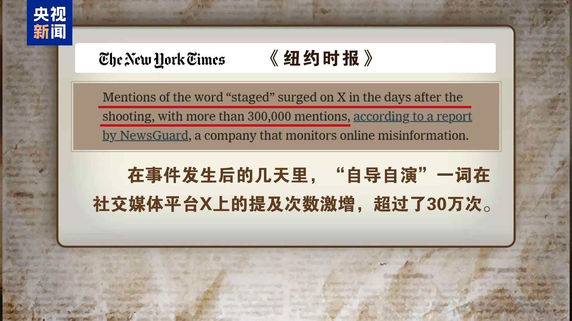 随后,这起事件是特朗普“自导自演”的说法很快就在网络上传播开来,《纽约时报》说,在事件发生后的几天里,“自导自演”(staged)一词在社交媒体平台X上的提及次数激增,超过了30万次。