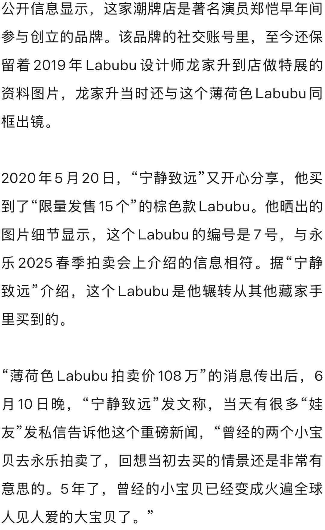 值得一提的是,“宁静致远”当时还一起转卖了一款棕色Labubu,此次它也出现在了拍卖会上,成交价为82万元,是当日拍卖会落槌价第二名。