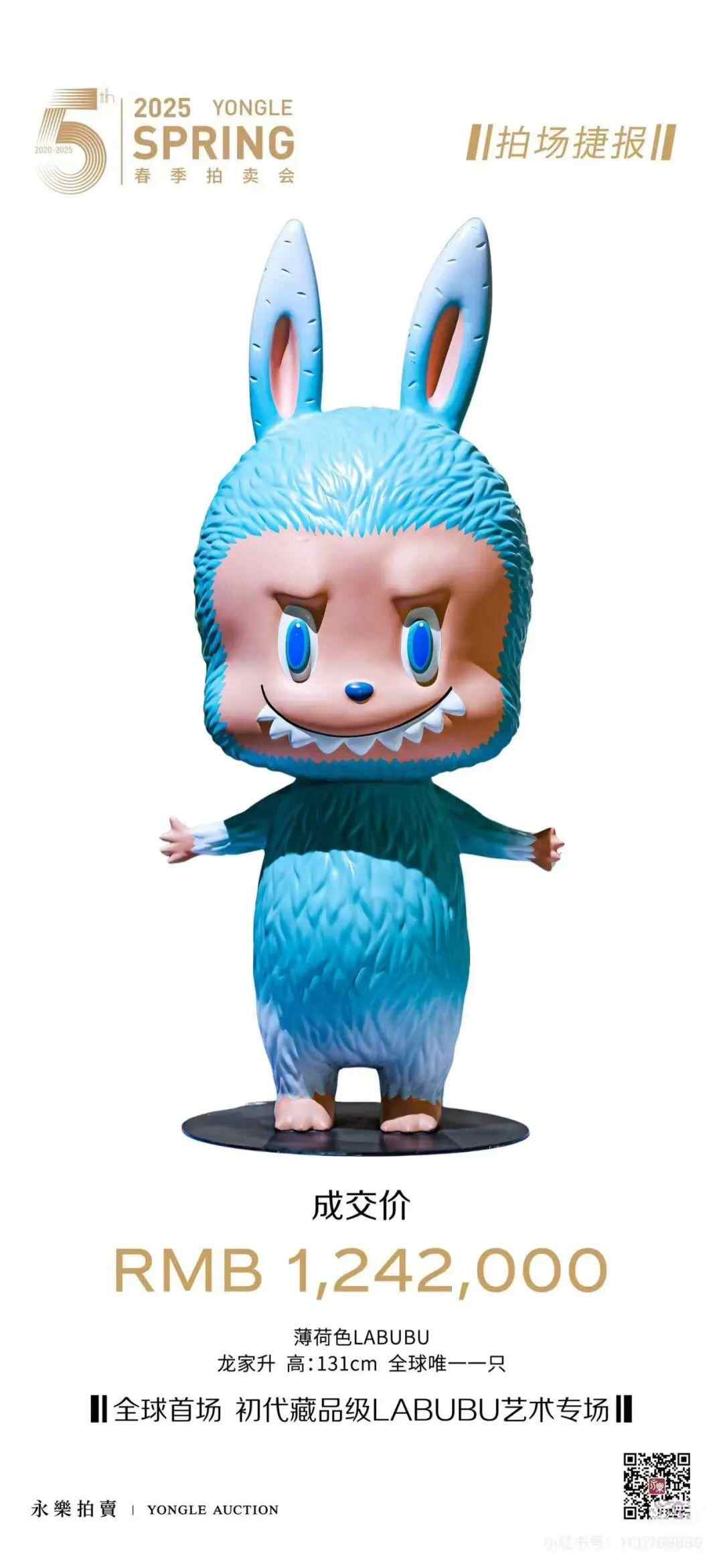 据永乐拍卖官方账号介绍,该场拍卖会的领衔拍品是一件高131厘米的薄荷色LABUBU雕塑,这是艺术家龙家升与泡泡玛特签约前的初代作品,采用PVC材质,标注为“全球唯一一只”。该拍品以无底价形式起拍,现场竞价激烈,最终以108万元落槌,含佣金成交价达124.2万元,由一位网络藏家购得,创下全球LABUBU雕塑拍卖最高价纪录。