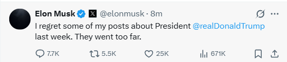 美东时间11日凌晨,特斯拉与SpaceX首席执行官埃隆·马斯克在其社交媒体平台“X”上表示,他对上周发表的一些关于美国总统特朗普的帖子感到后悔,称“内容说得太过了”。