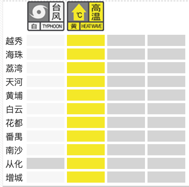气象台预计,6月13日-15日,广东将出现入汛以来最强的降水过程。部分河流水位将上涨,截至今天(6月12日)9时18分,广州越秀、海珠、荔湾、天河、黄埔、白云、花都、番禺、南沙、增城多区发布台风白色预警信号。