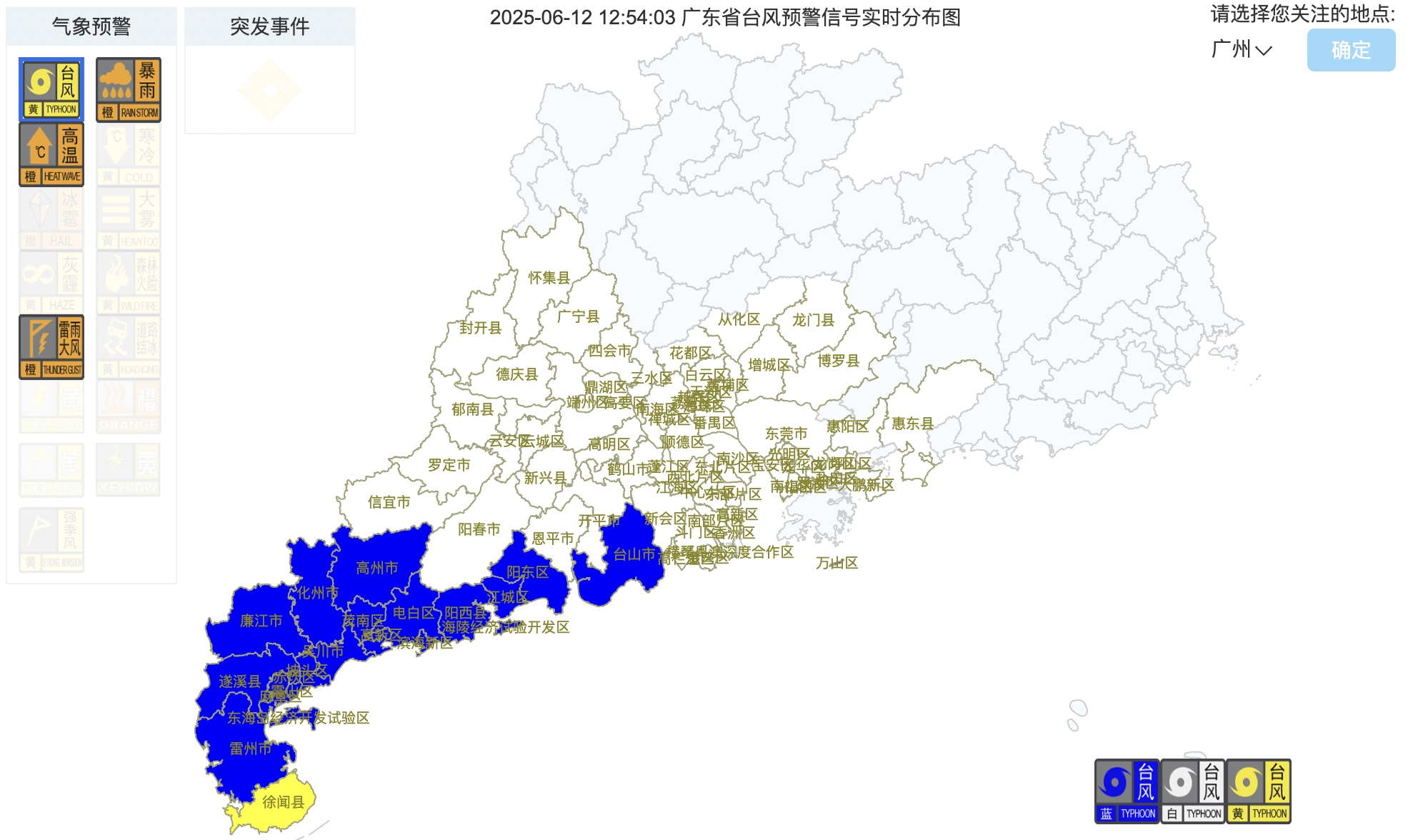 12日12时,徐闻率先发布了代表“进入台风防御状态,密切关注台风最新消息和政府及有关部门发布的防御台风通知;中小学校、幼儿园、托儿所应当停课”的台风黄色预警信号。截至12日12时54分,台山至雷州沿海及部分内陆地区,发布了台风蓝色预警信号。广东台风预警信号发布范围,从粤西沿海逐渐延伸至珠江口以东的沿海及内陆地区。