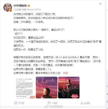 6月12日,邓紫棋发文称,与前公司的官司已经打了六年,已经超过六年没收到自己旧歌的版税,今天宣布重录旧作。