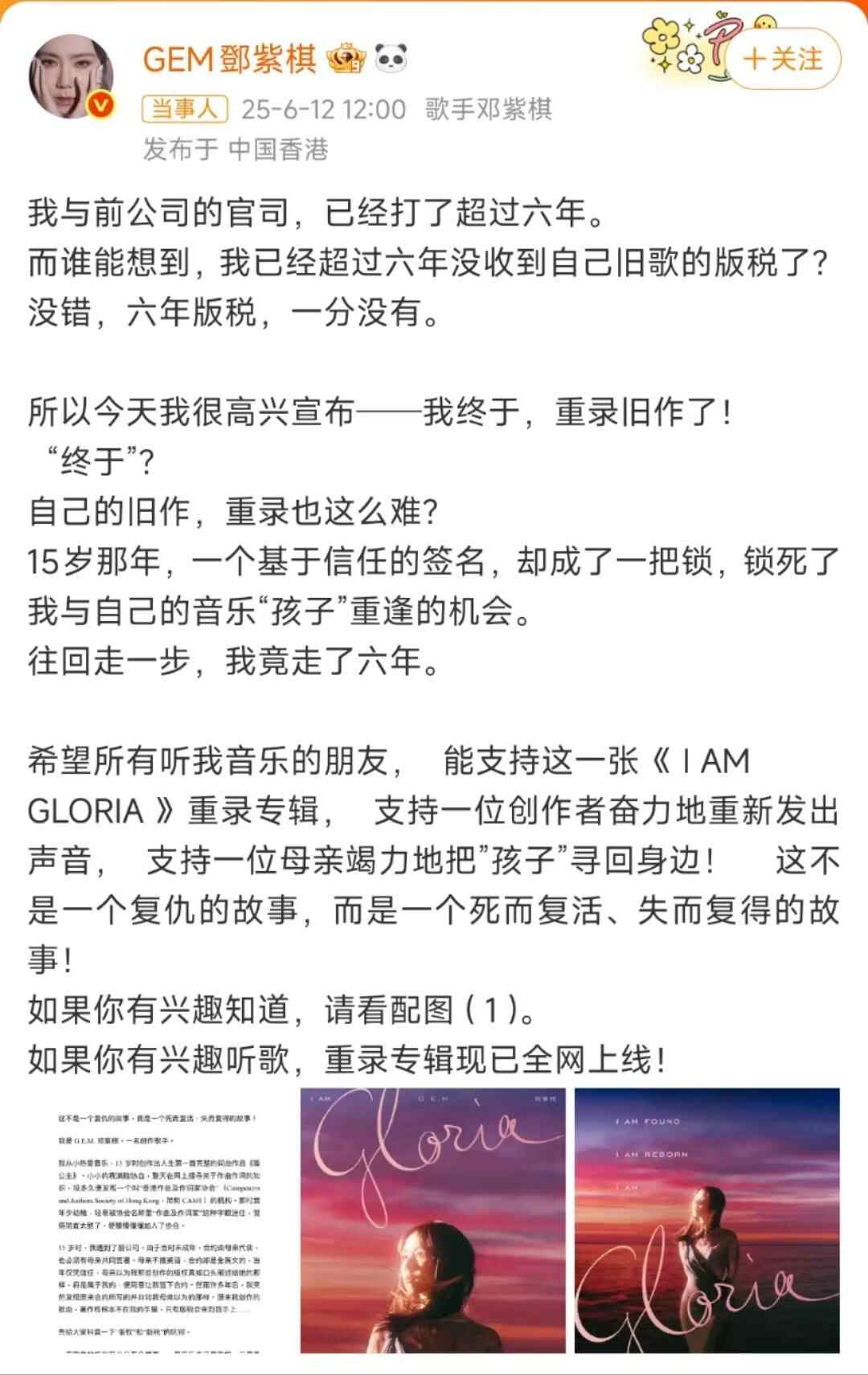 据悉,2024年1月,邓紫棋前经纪公司蜂鸟音乐公司就相关歌曲发布版权声明,称:“我公司(蜂鸟音乐有限公司)是以下所列音乐作品之录音、词曲版权独家所有人,拥有在全世界范围内将前述音乐作品以各种商业或非商业目的许可相关机构或个人使用的专有权利。未经我公司许可,禁止任何单位或个人将以下所列音乐作品用作翻唱、复制、演出、网络传播以及其他商业性用途。”