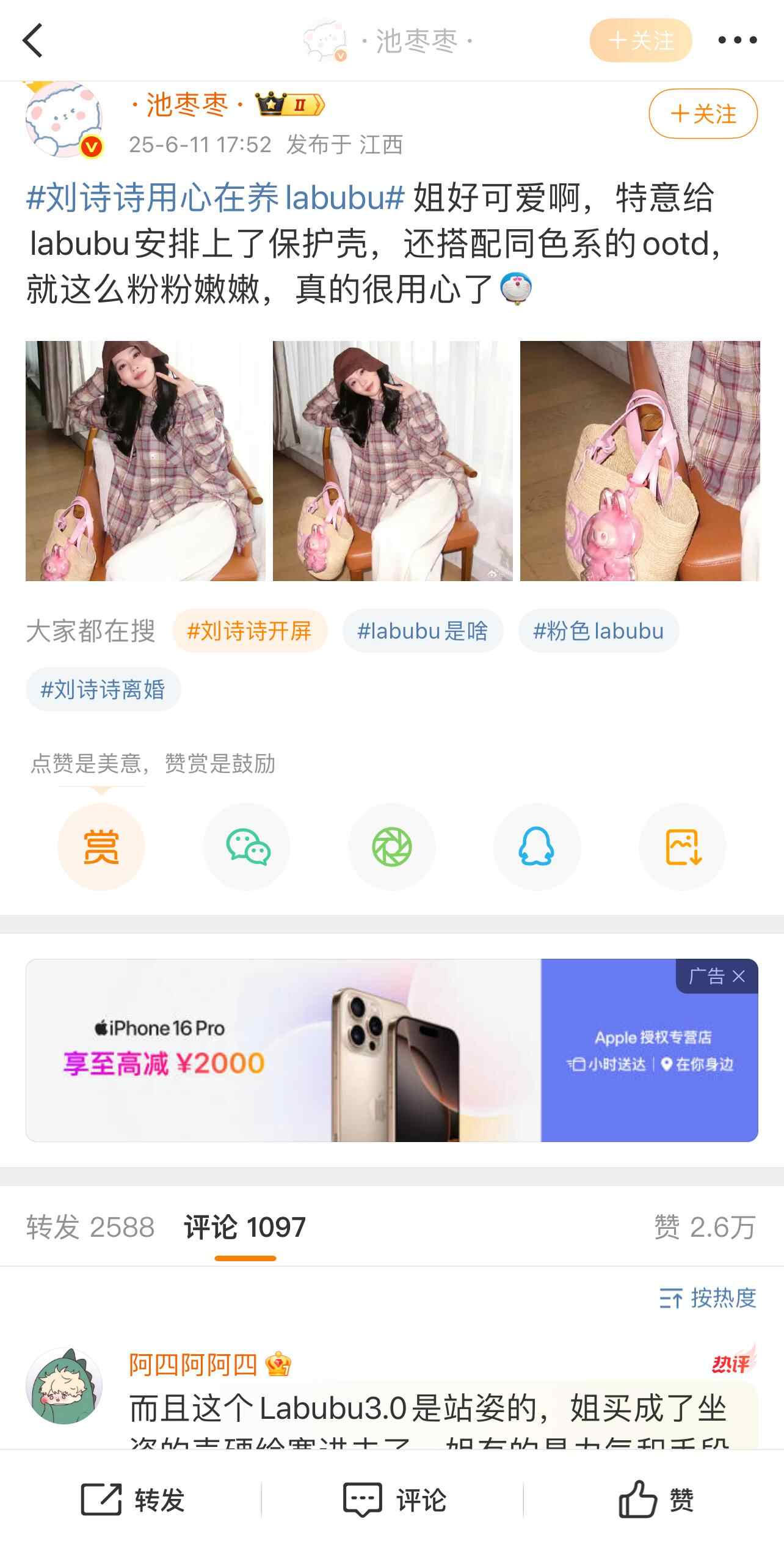 随着新晋网红Labubu风靡全球,不少明星、博主在社交平台上纷纷晒出了自己的Labubu照片。日前,有网友晒出演员刘诗诗“用心在养Labubu”的照片,引发许多人关注。照片中,Labubu被安排上了保护壳,并搭配了同色系的OOTD,“就这么粉粉嫩嫩,真的很用心了。”
