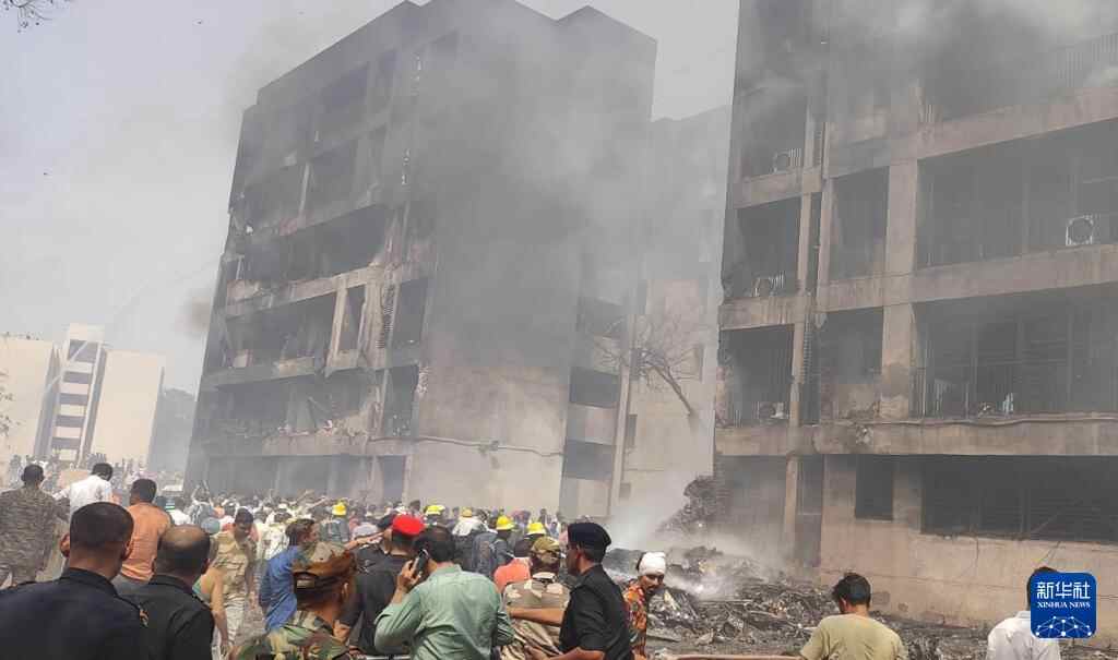 6月12日,消防员在印度古吉拉特邦艾哈迈达巴德附近坠机现场灭火。新华社/美联