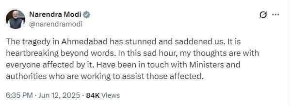 他称:“印度古吉拉特邦艾哈迈达巴德发生的悲剧让我们震惊和悲痛。”