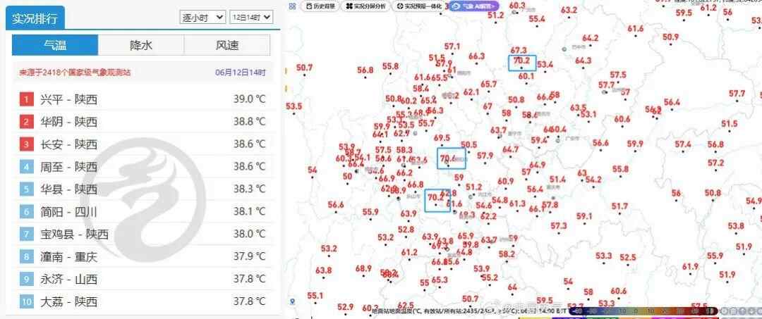 今天14时,陕西成为了全国最热的地方,包揽了高温排行榜前三位。同时,历史上同期少见的高温继续炙烤着四川盆地,资阳、阆中、荣县地表温度达到70℃+,热如“炼丹炉”!
