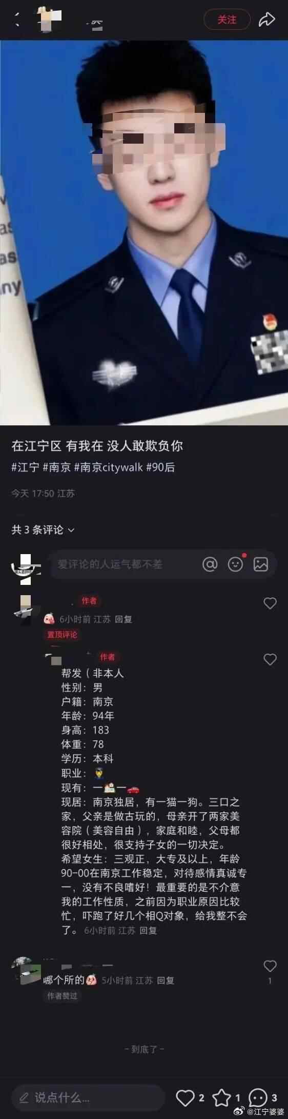 在小红书平台上,有一篇自称南京市江宁区民警的征婚帖,网帖中配有一张帅气民警的照片。“江宁婆婆”称自己也非常吃惊,江宁区有这么帅的新民警?“因为我隔壁就是管理人事的部门,每年新进的警花警草,不大可能有我没印象的。在和主管人事的同事反复确认后,确定照片为盗用。”