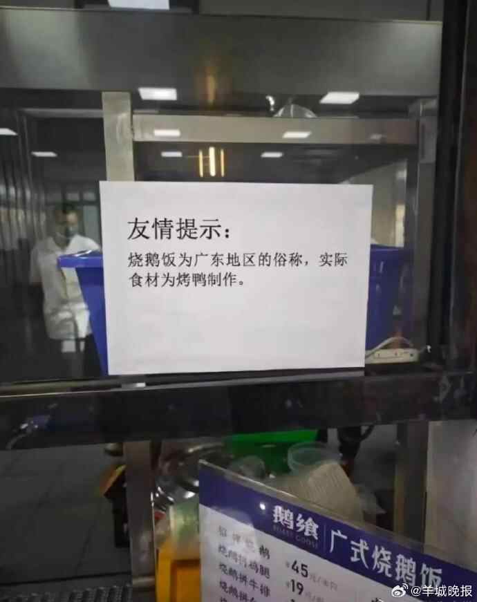 日前,武汉一高校医学部食堂三楼新开的一家名为“鹅飨广式烧鹅饭”的店内张贴的“友情提示”称,“烧鹅饭为广东地区俗称,实际食材为烤鸭制作”。涉事餐饮公司一位负责人称,“这个标语不是我们这家店的。”该高校饮食服务中心工作人员表示,已经登记所反映情况,将去调查并回电。但目前,涉事餐饮公司及校方尚未就争议标语归属达成明确结论。