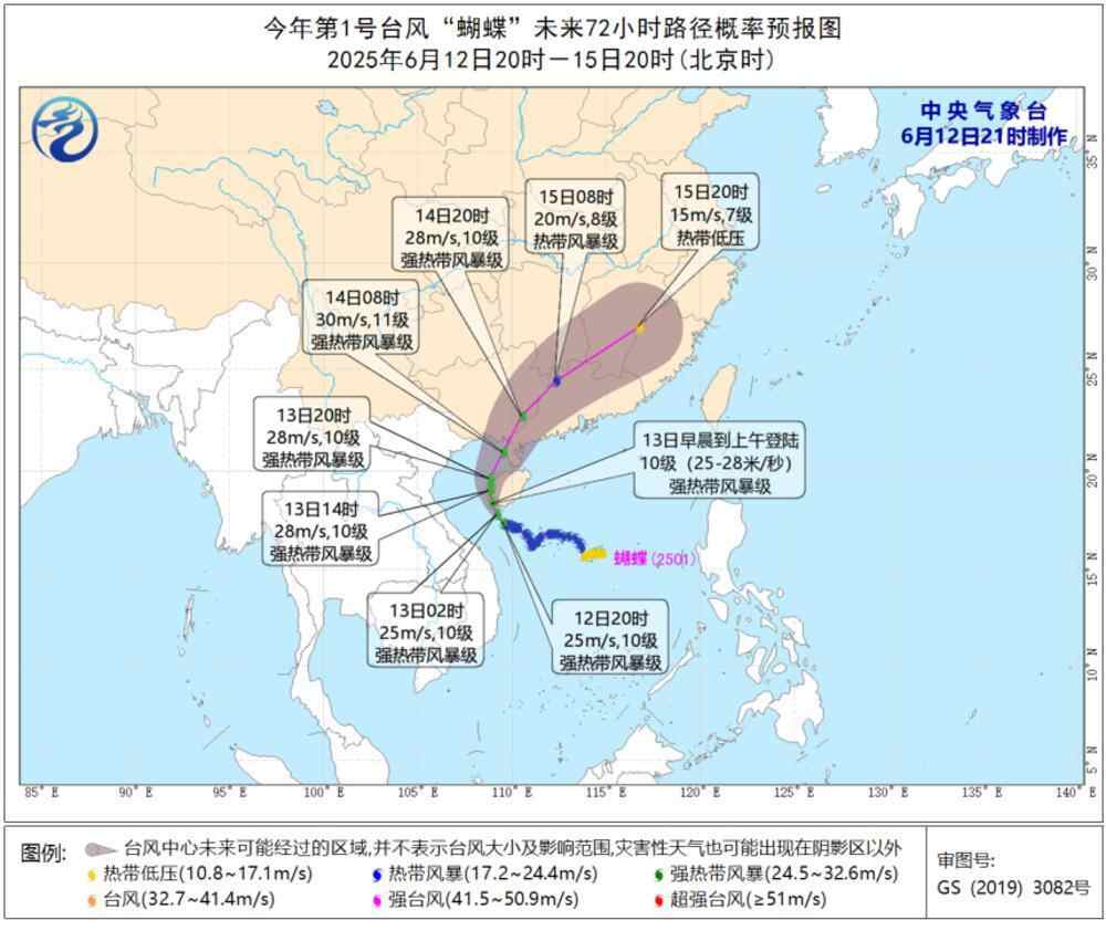 中央气象台预计,“蝴蝶”将以每小时10-15公里的速度向北偏西方向移动,强度逐渐增强,并将于13日早晨到上午在海南三亚至乐东一带沿海登陆(强热带风暴级,10级,25-28米/秒),14日早晨到上午在广东徐闻到广西北海再次登陆(强热带风暴级,10-11级,25-30米/秒),登陆后转向东北方向移动,强度逐渐减弱。