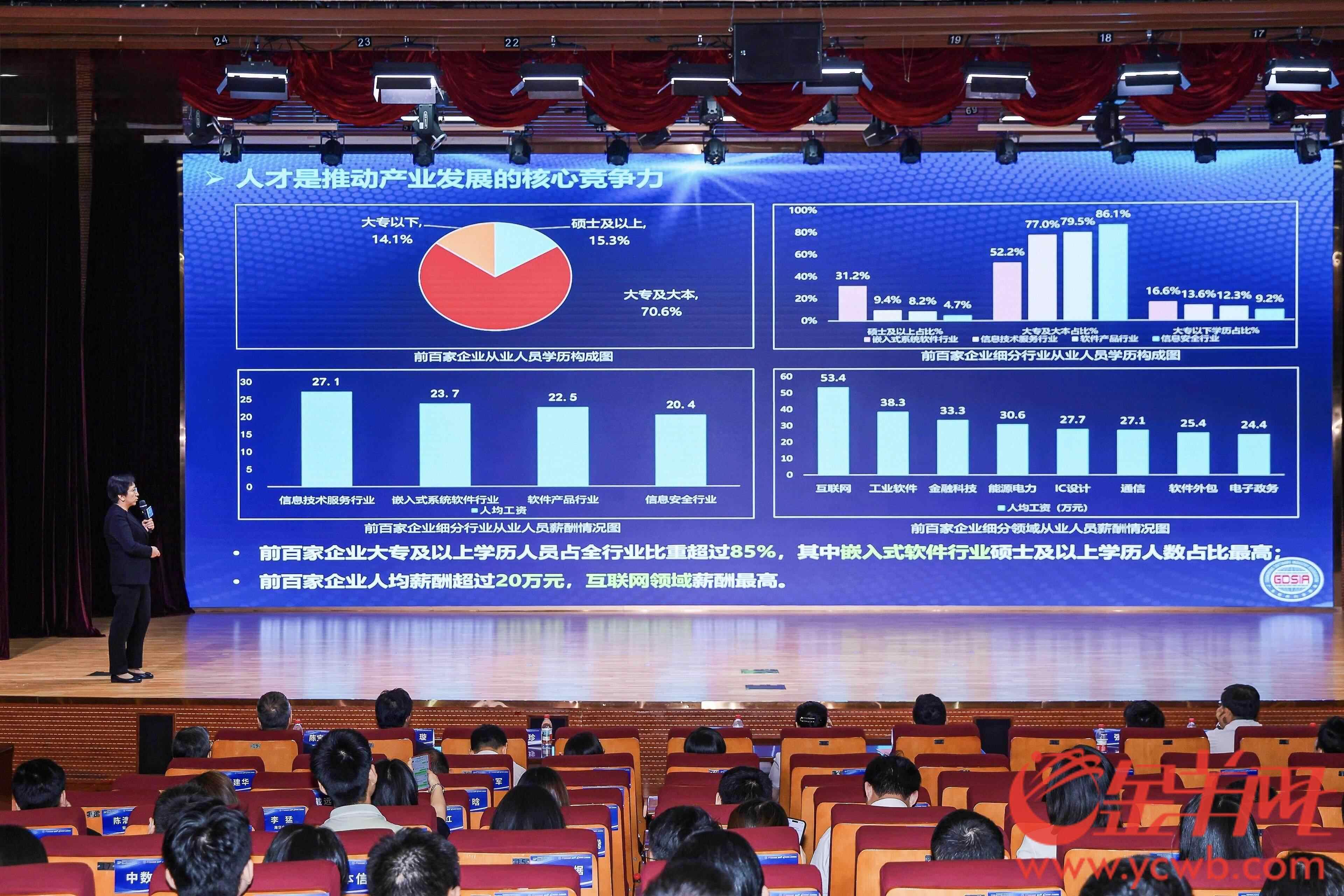 人才是推动产业发展的核心竞争力。报告显示,广东软件产业前百家企业大专及以上学历人员占全行业比重超过85%,其中嵌入式软件行业硕士及以上学历最高。前百家企业人均薪酬超过20万元,其中互联网领域薪酬最高。