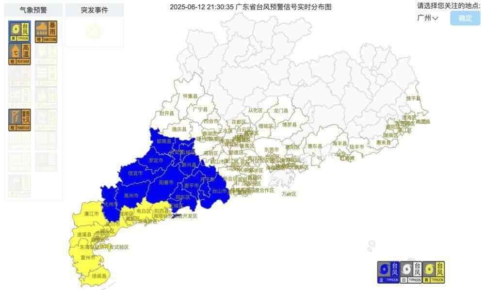 12日夜间,广东“停课信号”的发布范围逐渐增加。截至12日21时30分,湛江全市,茂名茂南、电白、滨海新区、高新区,阳江阳西等市县区,均已发布代表“进入台风防御状态,密切关注台风最新消息和政府及有关部门发布的防御台风通知;中小学校、幼儿园、托儿所应当停课”的台风黄色预警信号。