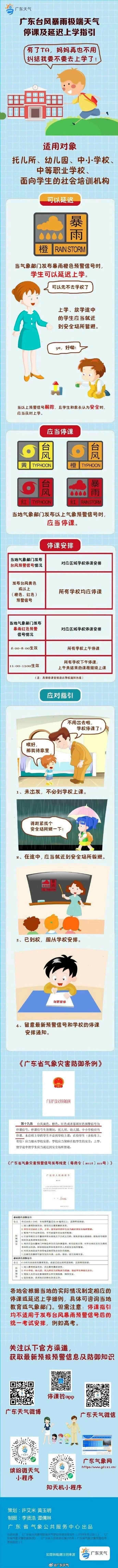 广东省气象部门12日夜间表示,根据《广东省气象灾害防御条例》规定,当气象部门发布台风黄色、橙色、红色预警信号和暴雨红色预警信号,可视为停课信号,托儿所、幼儿园、中小学校、中等职业学校应当停课;当气象部门发布暴雨橙色预警信号,学生可以延迟上学,上学、放学途中的学生应当就近到安全场所暂避。