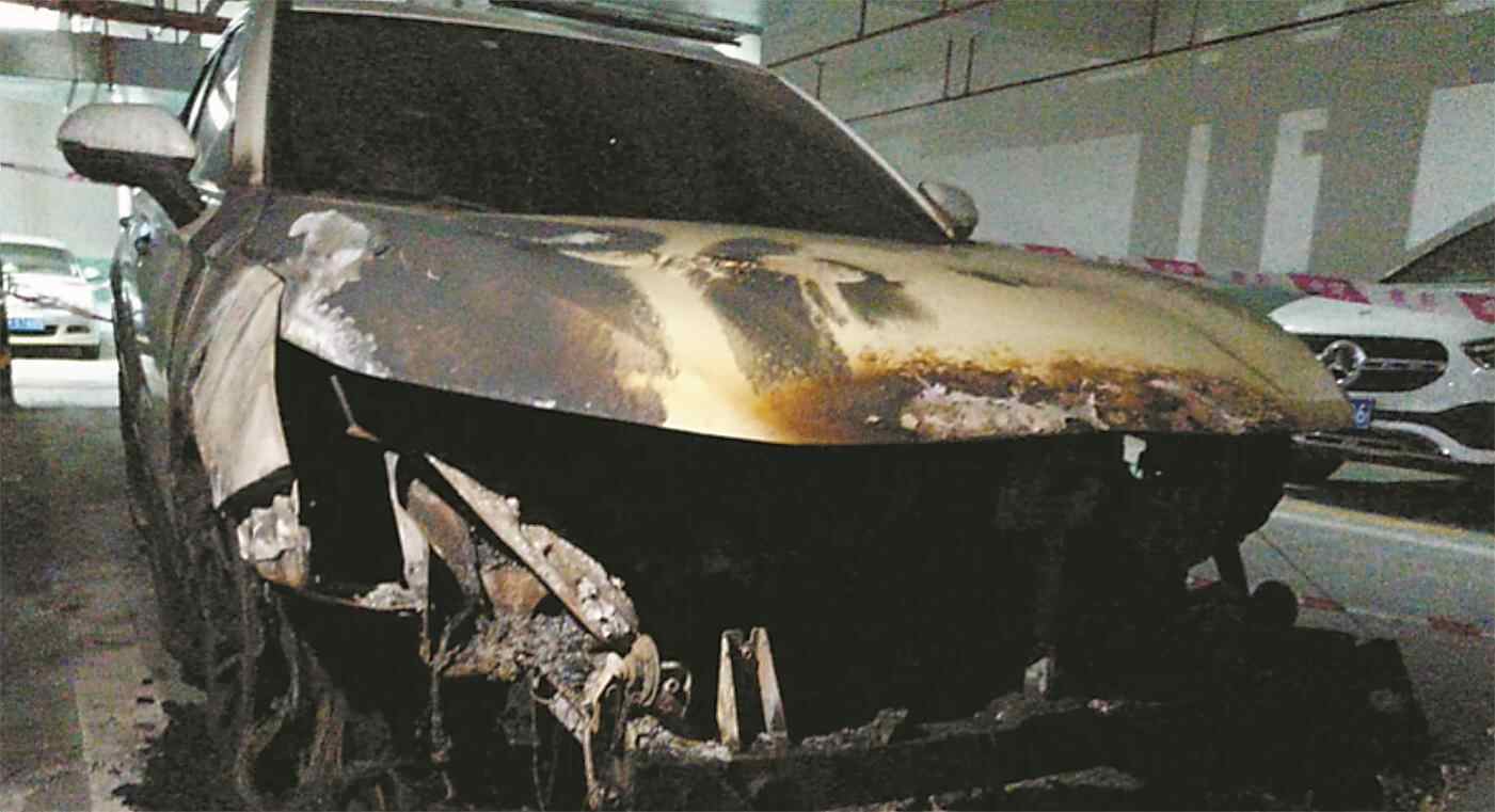 记者从业主拍摄的现场照片中看到,起火车辆牌照为湘D,前半部分已被严重烧毁,只剩下框架。车辆前上方的通风管道发生坍塌,大片金属风管扭曲、脱落,砸在前方车辆上。周边车辆也有明显烧蚀痕迹,地面有烟熏痕迹和水迹残留。