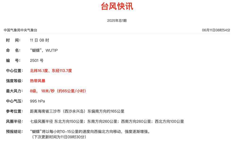 根据中央气象台6月11日8时54分发布的台风快讯,位于南海的热带低压,已在当天8时加强为今年第1号台风,并被命名为“蝴蝶”(英文名:Wutip;名字来源:中国澳门;意义:一种昆虫)。