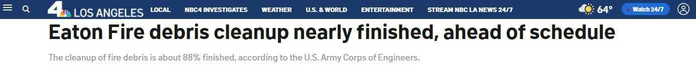 截至5月30日,仅洛杉矶伊顿山火中受灾程度最重的阿尔塔迪纳地区,其山火废墟清理工作仅完成约88%。即便如此,当地媒体在对废墟清理工作的报道中仍然使用了“接近提前完成”的表述。因为此前的清理计划是到2026年1月前完成。