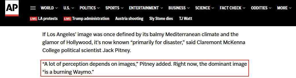 “很多感知都取决于图像,但目前有关洛杉矶市的主流印象,都是一张张燃烧的无人驾驶出租车的图片。”