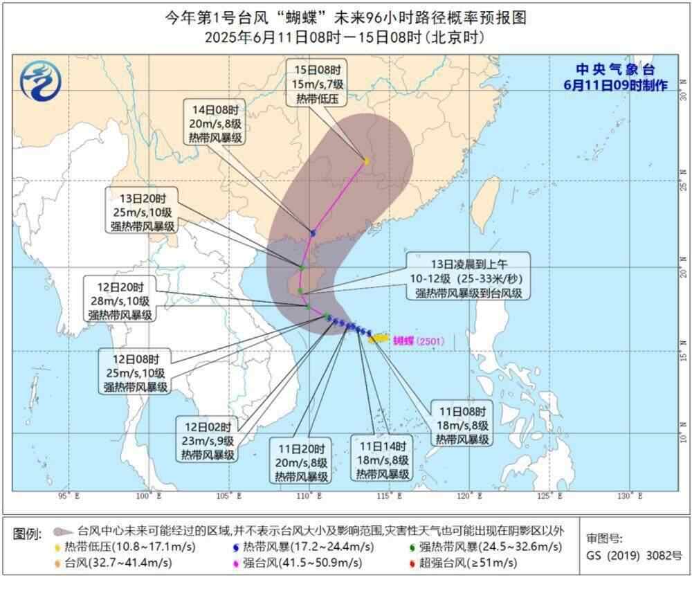 根据中央气象台6月11日8时54分发布的台风快讯,位于南海的热带低压,已在当天8时加强为今年第1号台风,并被命名为“蝴蝶”(英文名:Wutip;名字来源:中国澳门;意义:一种昆虫)。