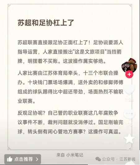 近期,网上有人发帖称:“苏超”直接跟中国足协正面杠上了!足协说要派人指导运营,江苏足协直接搬出“这是文旅项目”当挡箭牌,明摆着不买账。