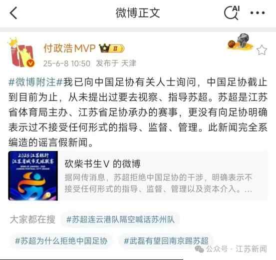 另据体育媒体人付政浩的微博,他也询问了中国足协有关人士,对方也表示:截止到目前为止,从未提出过要去视察、指导苏超。“苏超”是江苏省体育局主办、江苏省足协承办的赛事,更没有向足协明确表示过不接受任何形式的指导、监督、管理。