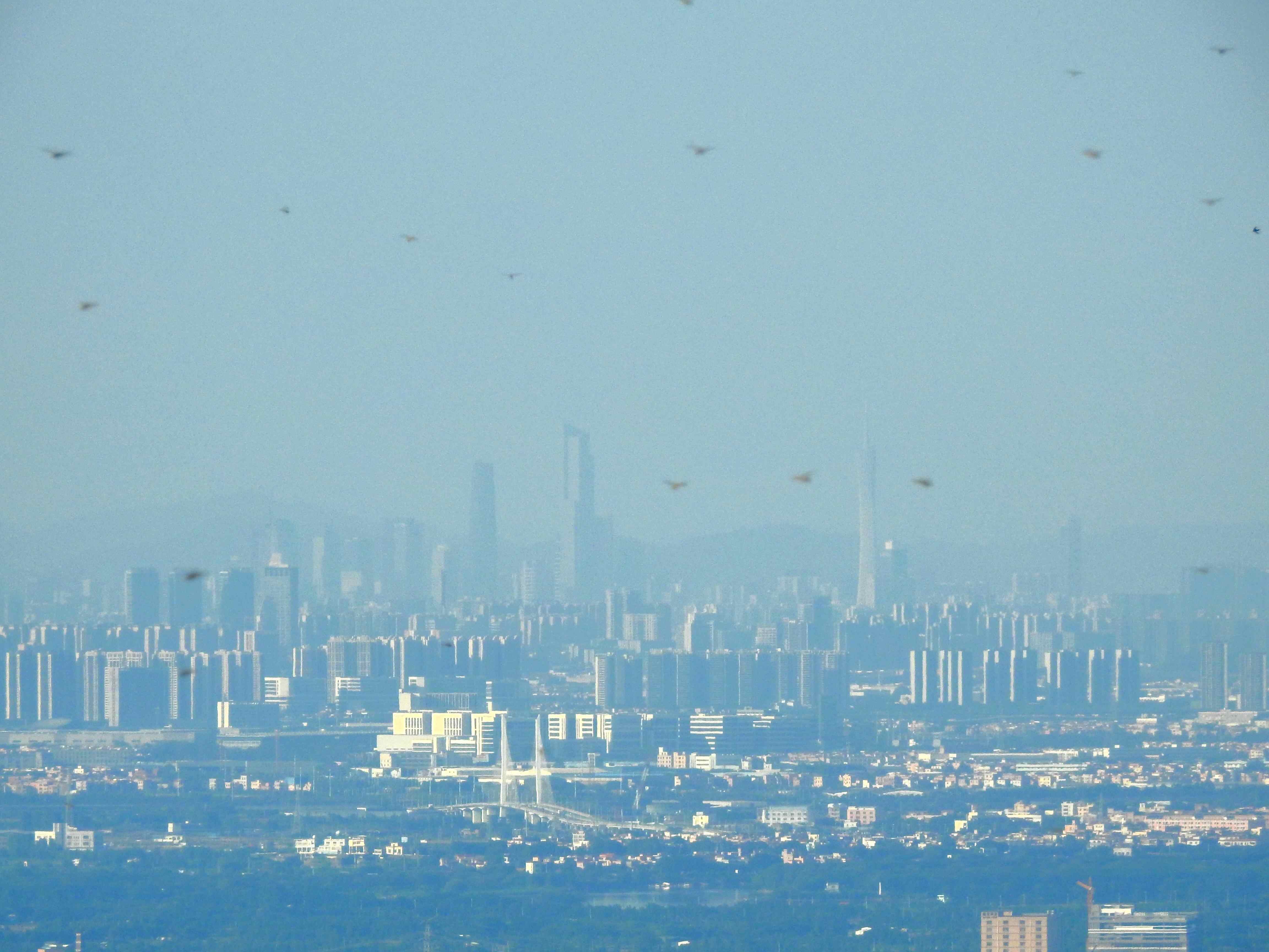 照片中,从大雁山上的纪元塔往东北方向远眺,珠三角平原一马平川,城市景观十分壮观,视角尽头即可看到三座高耸入云的建筑物,经确认,这些建筑物正是广州的三座超高层地标:广州“小蛮腰”、广州东塔(广州周大福金融中心)和广州西塔(广州国际金融中心)。