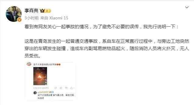 今天(11日)上午,小米汽车副总裁@李肖爽对此事发文称,看到有网友关心一起事故的情况,为了避免不必要的误传,先行说明一下:这是在青岛发生的一起普通交通事故,系自车在正常直行过程中,与旁边工地突然穿出的车辆发生碰撞,造成车内副驾易燃物品起火,随后消防人员将火扑灭,无人员受伤。目前,当地警方和消防部门尚未对此事发布官方通报。