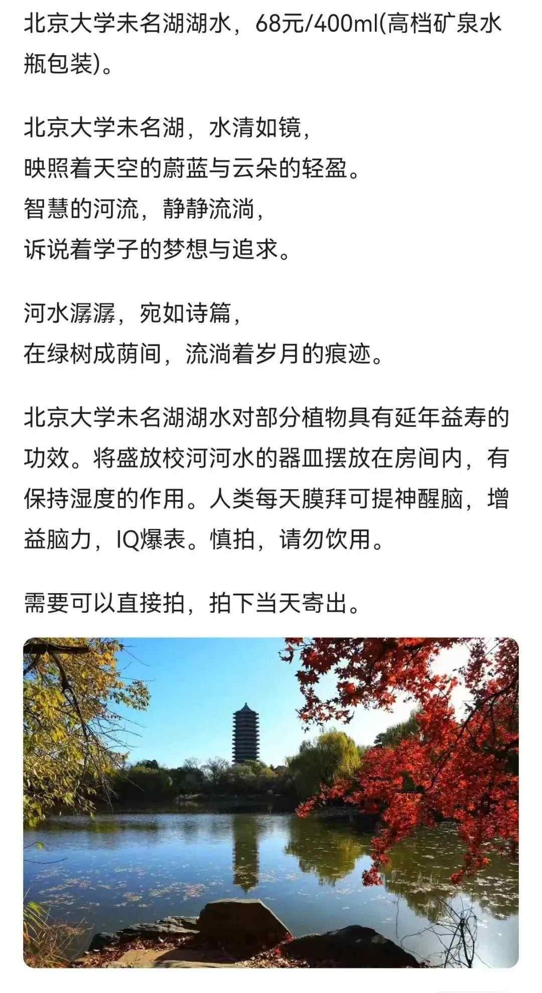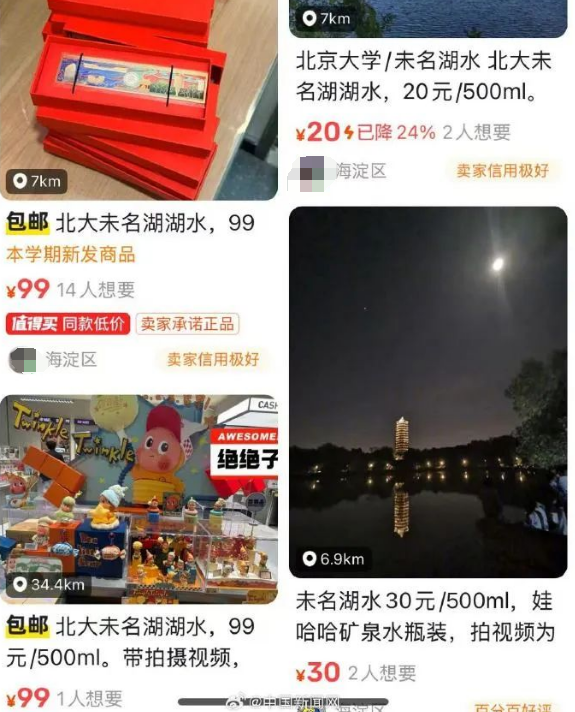据@新京报 消息,记者联系一名商家询问,商家表示未名湖水在售,可以寄送外地,快递包邮。而据@中国新闻网 报道,记者询问某商家是否还有未名湖湖水,直接遭到对方咒骂、拉黑。