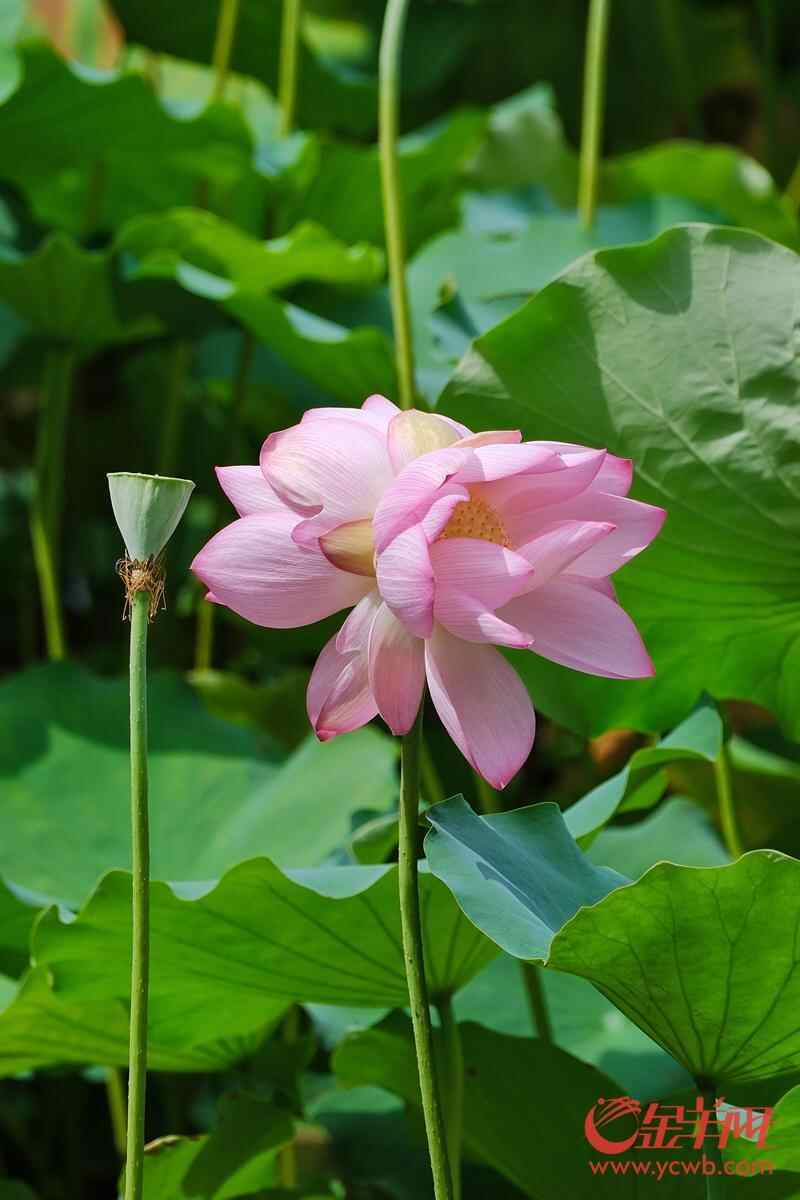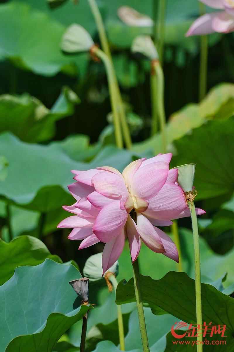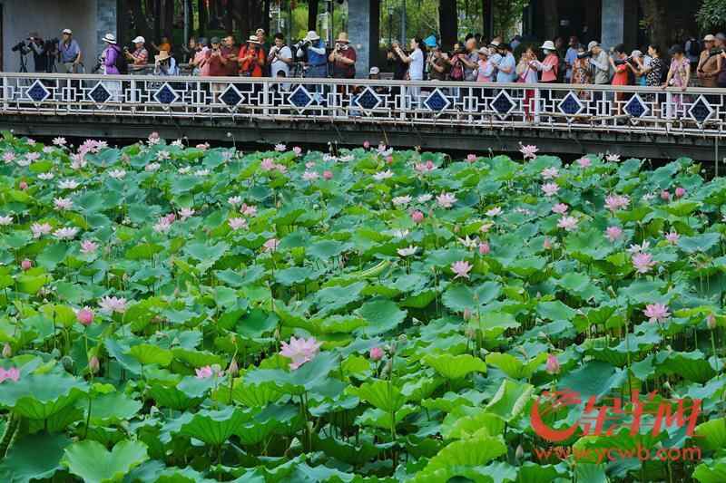 6月11日,广州荔湾湖公园荷塘荷花竞相绽放,进入夏日最佳观赏期。一株罕见的并蒂莲在连片荷叶间脱颖而出,粉白双花同茎而生,宛若孪生仙子起舞,引得大批摄影爱好者架起“长枪短炮”,定格一茎双花奇观。
