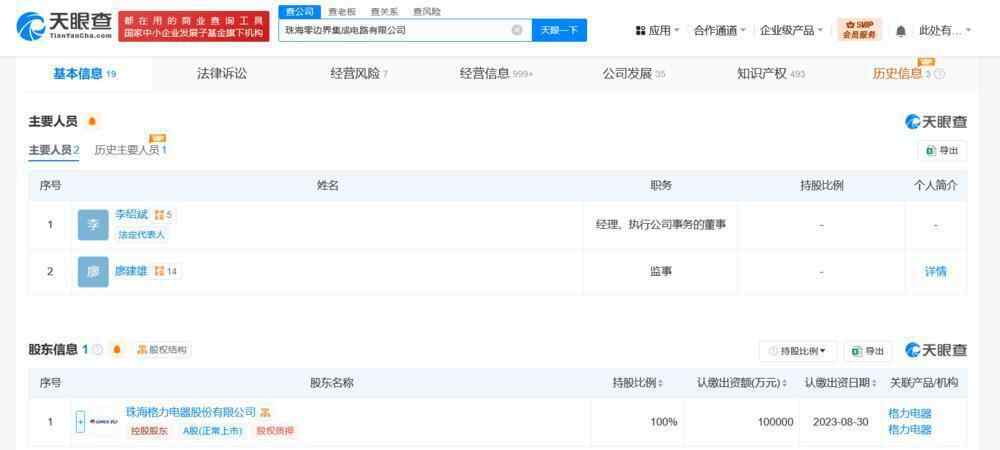 天眼查App显示,近日,董明珠卸任珠海零边界集成电路有限公司(以下简称“零边界公司”)法定代表人、董事长,由李绍斌接任法定代表人,并接任执行公司事务的董事、经理。
