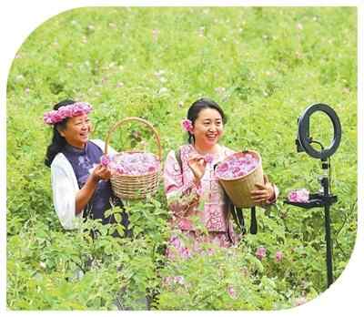 甘肃陇南市两当县金洞乡袁家沟村,电商主播(右)正与农户直播推介玫瑰花。