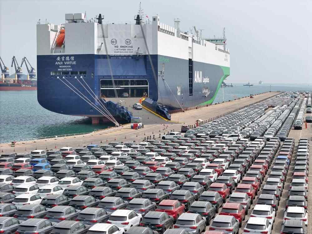 4月18日,“安吉德信”轮在山东港口烟台港装运出口汽车(无人机照片)。新华社发(唐克 摄)