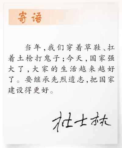 退伍回到家乡,杜士林一直保持着军人本色,在田地里辛勤劳作,到学校给孩子们讲述那段波澜壮阔的历史……杜士林的子女告诉记者,虽然父亲年岁已高,可只要一谈起那段烽火岁月,便立刻精神十足。