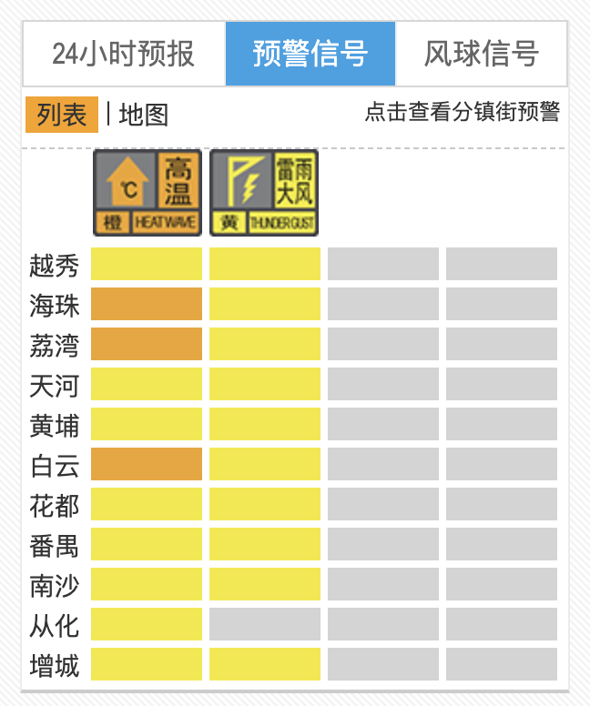 截至11日16时13分,除从化区外,广州其余各区均已发布雷雨大风黄色预警信号;另外,广州所有行政区均仍维持发布高温黄色或以上等级预警信号,其中海珠、荔湾、白云发布高温橙色预警信号。随着高温和雨势发展,不排除广州各区后续继续发布或调整预警信号,请市民做好防御工作。