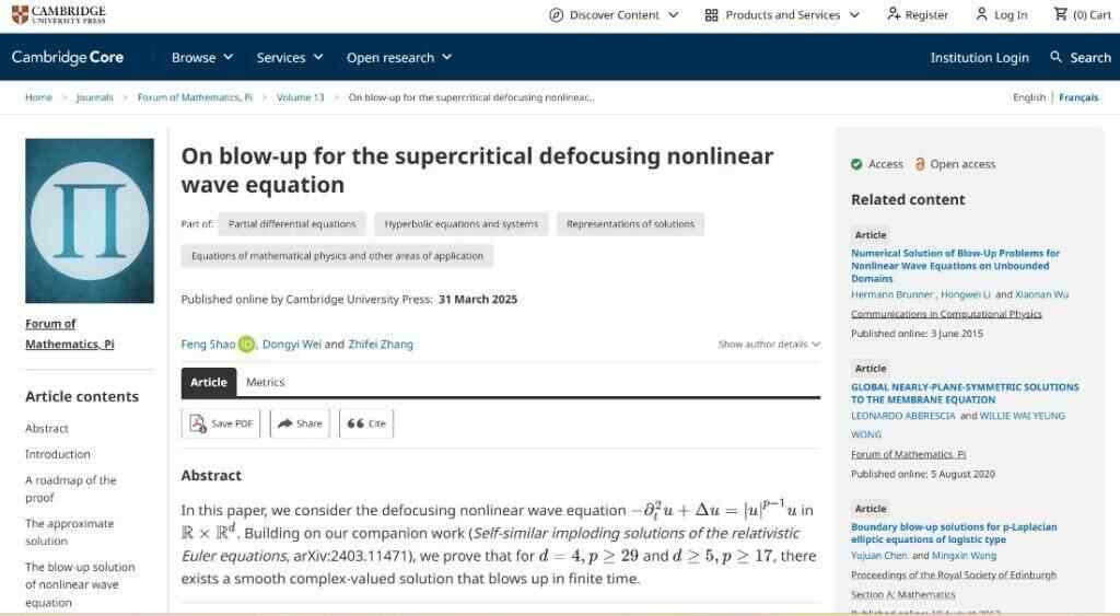 记者注意到,在舆论喧嚣之外,专注学术的韦东奕近日与其他两位学者章志飞、邵锋合作在数学界顶级期刊《Forum of Mathematics, Pi(数学论坛,π)》以“On blow-up for the supercritical defocusing nonlinear wave equation(超临界散焦非线性波动方程的爆破现象研究)”为题发文。