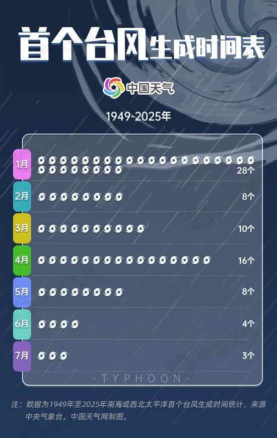这些台风往往生成时间都偏晚。根据1949年至2024年的数据统计,历年1号台风平均生成时间为3月下旬,“首台即登陆”的6个台风,生成时间集中在4月至7月,其中1998年的台风“Nichole”和2016年的台风“尼伯特”都是7月才生成,较常年偏晚三个多月。