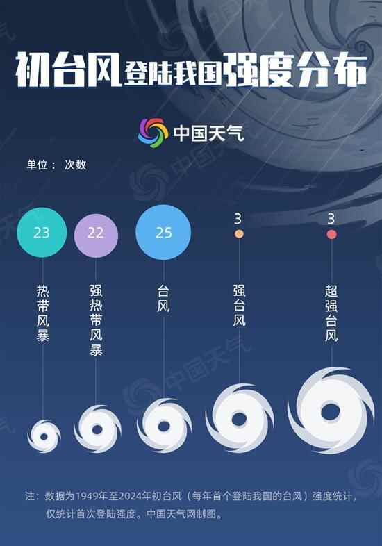 从1949年至2024年气象数据可以发现,初台风登陆我国的强度普遍不太强,近六成为热带风暴和强热带风暴的级别。不过,初台风也有强势的,过去76年里,也曾有3个初台风登陆时为超强台风级别,威力不可小觑。