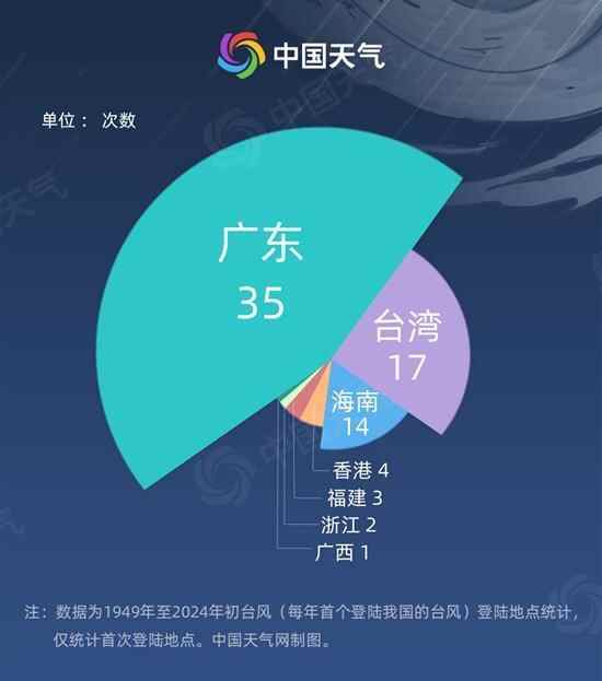 在过去76年中,有35年初台风登陆广东、17年登陆台湾、14年登陆海南,分别占到总数的46%、22%、18%。此外,香港、福建、浙江、广西也均有初台风登陆。