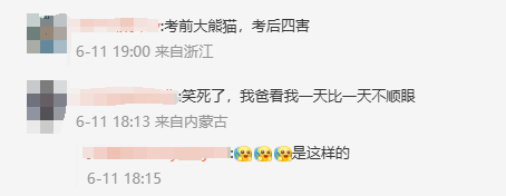 不少网友感同身受,表示高考以后就没在家里吃过好吃的。还有网友调侃高考生“考前是大熊猫,考后是‘四害’”。