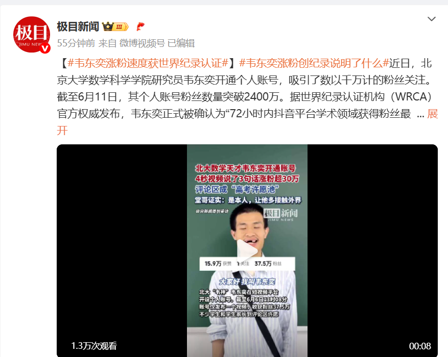 近日,北京大学数学科学学院研究员韦东奕开通个人账号,吸引了数以千万计的粉丝关注。截至6月11日20时许,其个人账号粉丝数量突破2440万。据世界纪录认证机构(WRCA)官方权威发布,韦东奕正式被确认为“72小时内抖音平台学术领域获得粉丝最多的人”。