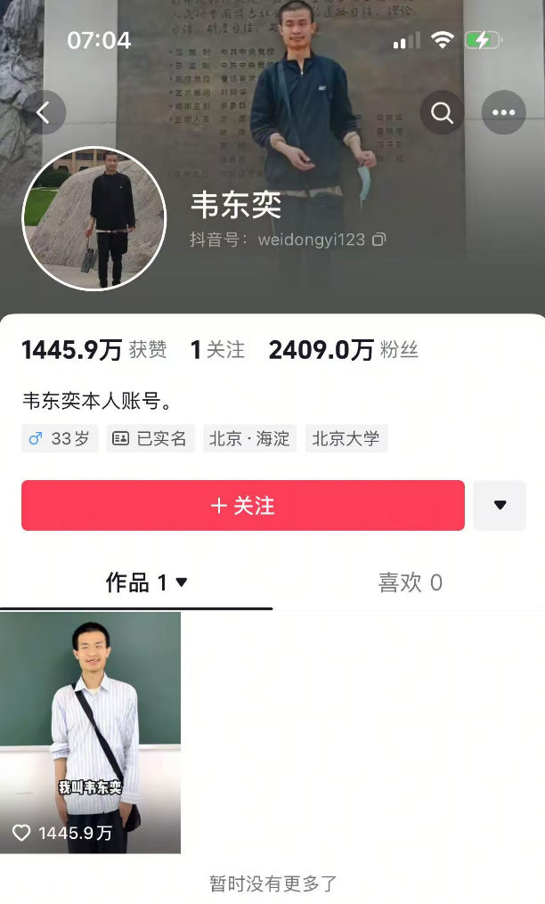 截至6月10日7时,韦东奕账号粉丝量已突破2400万。